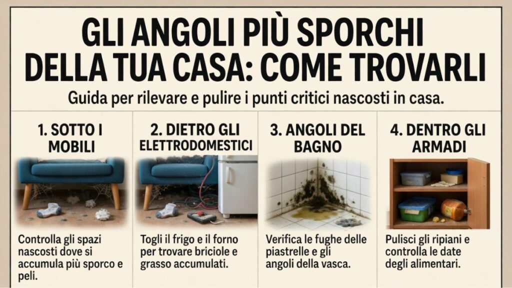 Quando pensiamo alle pulizie di casa, ci concentriamo quasi sempre sulle superfici visibili: pavimenti, tavoli, bagno. Eppure esistono angoli e spazi che ignoriamo sistematicamente, lasciando che accumulino polvere, batteri e disordine. Queste zone nascoste diventano nel tempo veri e propri ricettacoli di sporco, con conseguenze sulla salute e sul benessere domestico. Scoprire dove si annidano questi punti critici è il primo passo per una casa davvero pulita e organizzata.